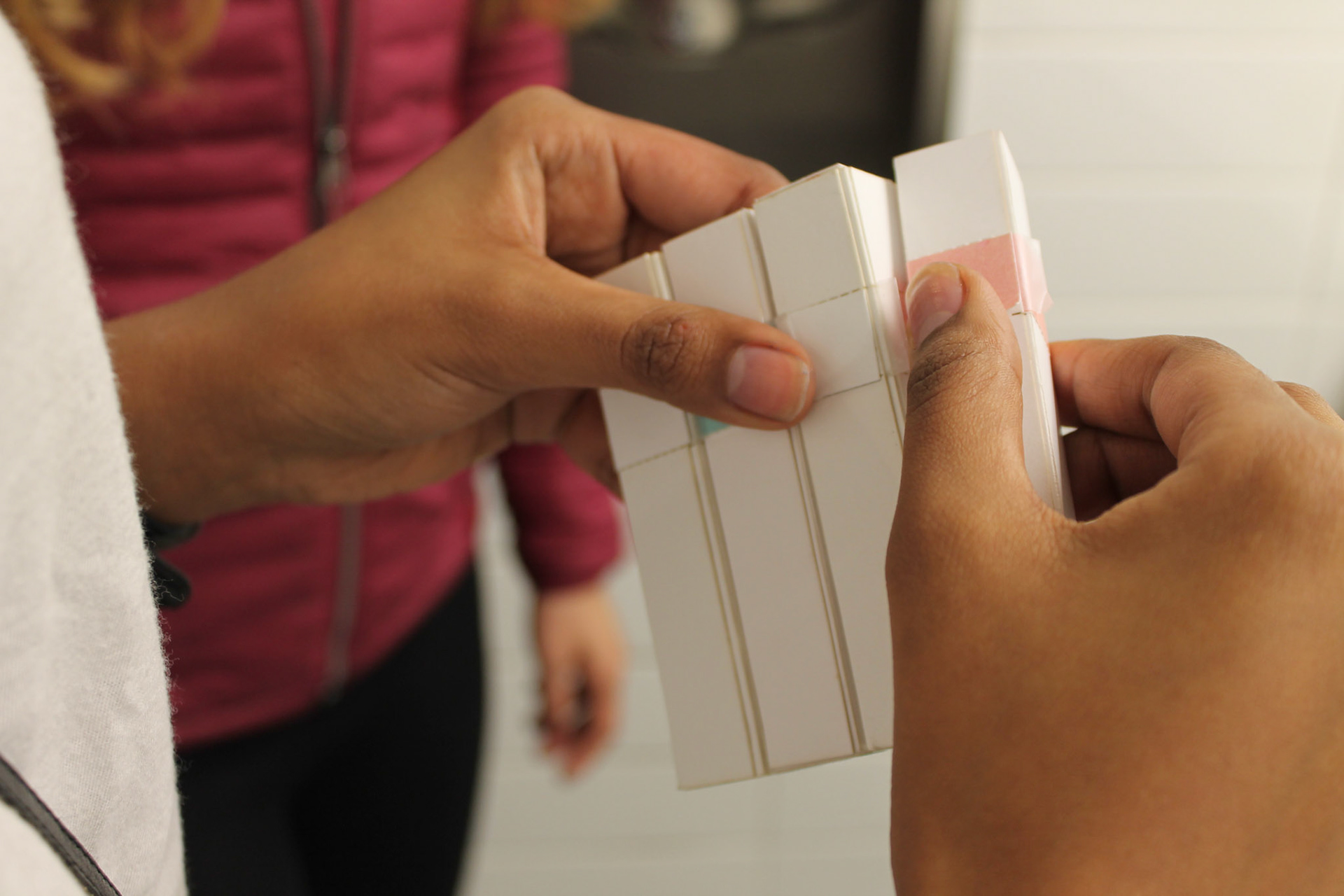 Creating new menstrual pad packaging that embodies a product that is meant to be shared. Pads come in packs of four with a case pack including 16 pads. Not meant to be used at home but throughout the day while interacting with other women. Pads can be torn off with color code indicating whether the message on the inside is pink or mint.